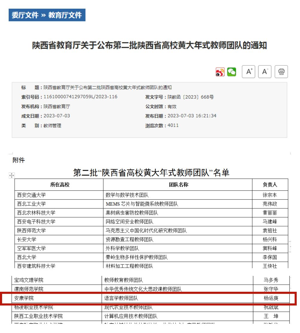 7月3日,根据陕西省教育厅印发的《陕西省教育厅关于公布第二批陕西省高校黄大年式教师团队的通知》(陕教函〔2023〕668号),公司杨运庚教授牵头申报的“伟德语言学教师团队”荣获第二批陕西省高校黄大年式教师团队创建项目。