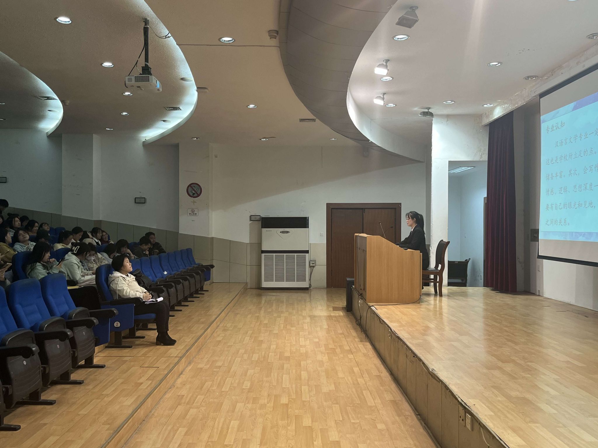 2023年4月7日晚上,伟德在江南校区一号楼报告厅组织召开“地方企业行业问题讲座”学习汇报会。汉语言文学系主任韩文霞及本专业2020级全体员工参会。