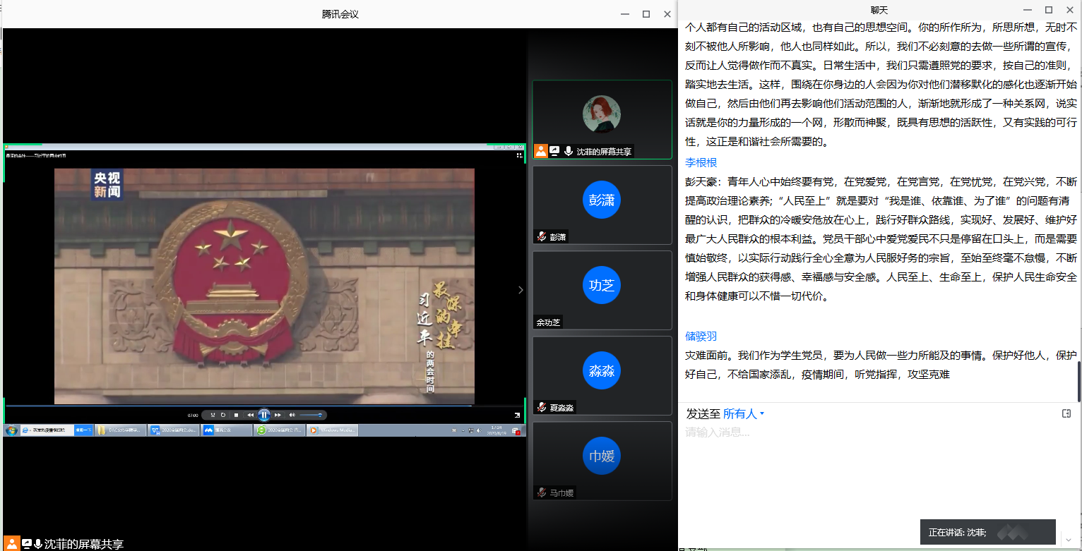 活动伊始,沈菲就今年的两会给大家做了详细介绍,接着,大家集中观看视频《最深的牵挂--习近平的两会时间》,进一步感受习近平总书记的人民情怀,就“作为当代青年如何将‘人民至上、生命至上’的真挚情感实际践行”这一话题,支部党员们结合自身经历踊跃发言。