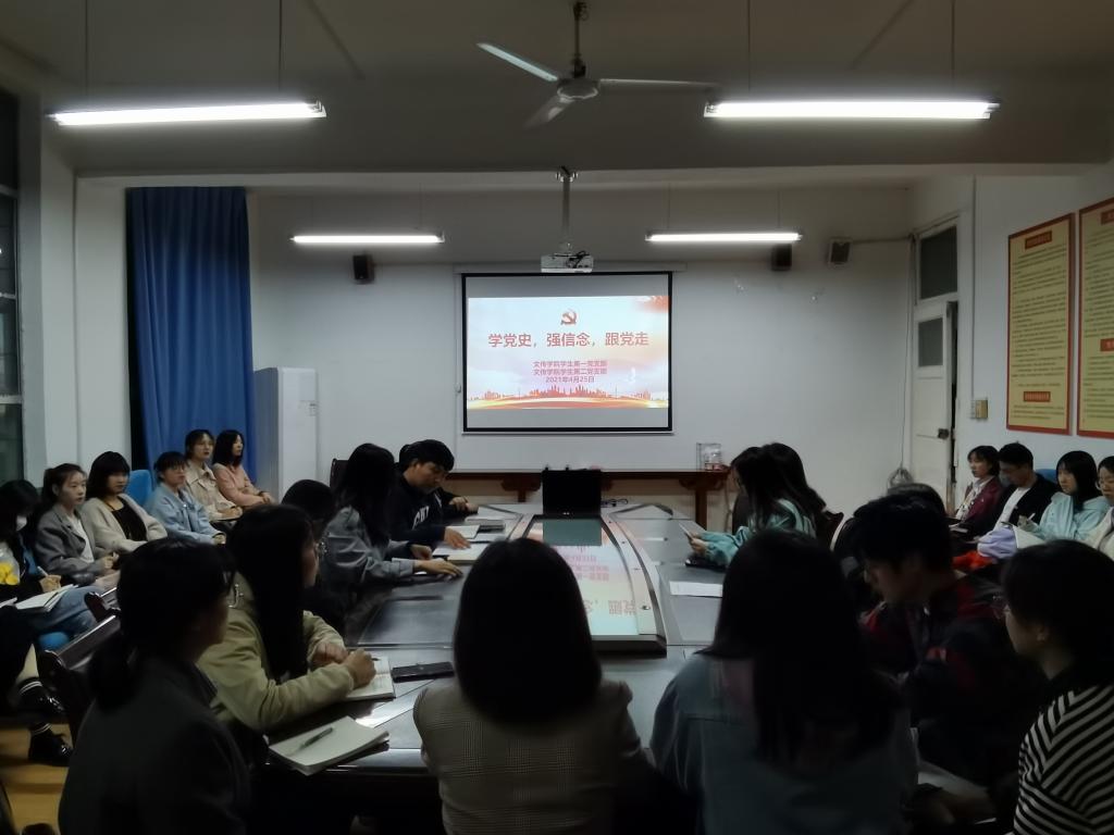 百年征程波澜壮阔,百年初心历久弥坚。2021年是中国共产党成立100周年,为认真贯彻习近平总书记在党史学习教育动员大会上的重要讲话精神,引领广大党员深入学习党的历史,做到学史明理、学史增信、学史崇德、学史力行。2021年4月25日晚上7:00,伟德员工第一、第二党支部在2号教学楼2307教室联合开展了“学党史、强信念、跟党走”主题党日活动。员工第一、第二党支部全体党员参加了本次活动。活动由员工第一党支部书记彭潇主持。