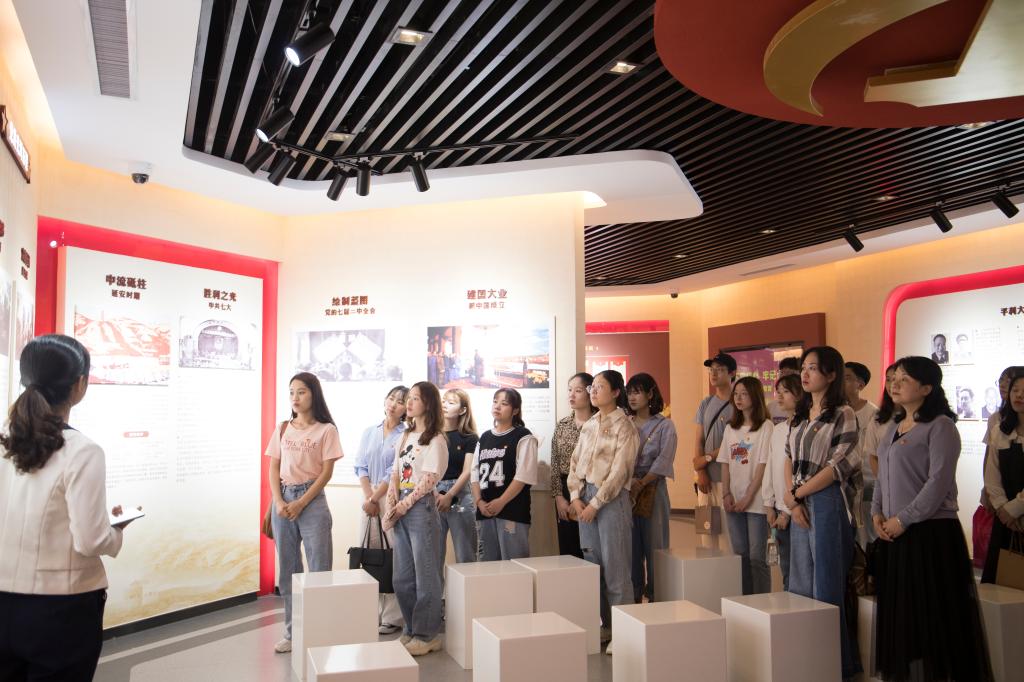 上午8:30,员工党员在公司2号教学楼集中,员工第二党支部书记薛涛带领大家参观了文学与传媒公司党史教育展板。