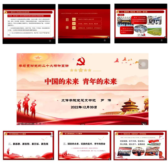 为促进青年学子学习贯彻党的二十大精神,进一步深刻领会习近平新时代中国特色社会主义思想,加强青年员工的培养、凝聚青年员工力量,引导青年担当时代责任。12月9日晚,公司党总支书记芦伟以“中国的未来 青年的未来”为题,为2022级员工宣讲党的二十大精神暨新生入学教育第六讲。本次宣讲会通过腾讯会议召开,会议由辅导员李欣逸主持。