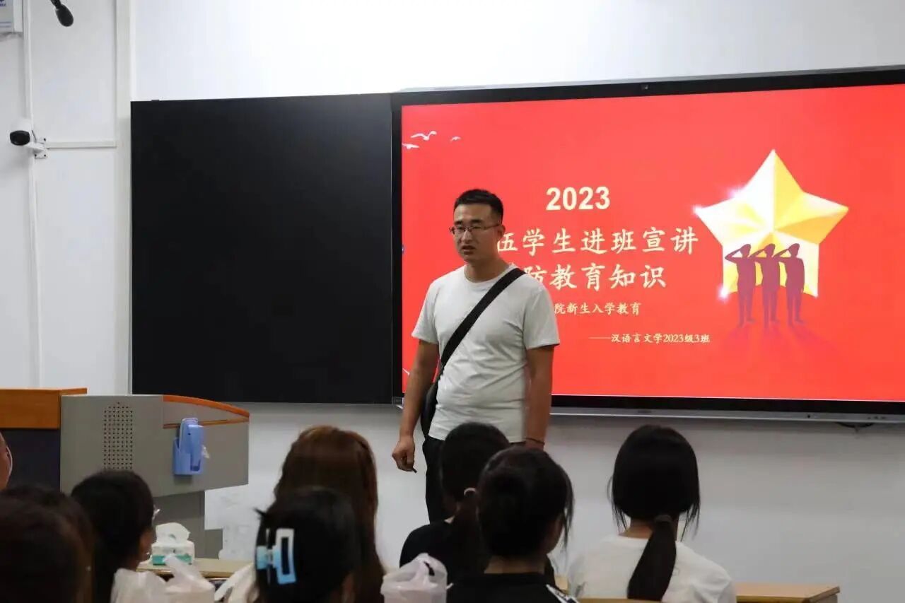 为引导广大青少年赓续红色血脉,树立国防意识,进一步贯彻落实习近平总书记关于加强全民国防教育的重要指示精神,9月12日下午,伟德在一号教学楼举办国防教育知识宣讲暨新生入学教育讲座,并邀请退伍员工艾佳新、桑雪、严庆、刘寒龙、张振豫进入各班讲授,2023级全体新生参加此次活动。