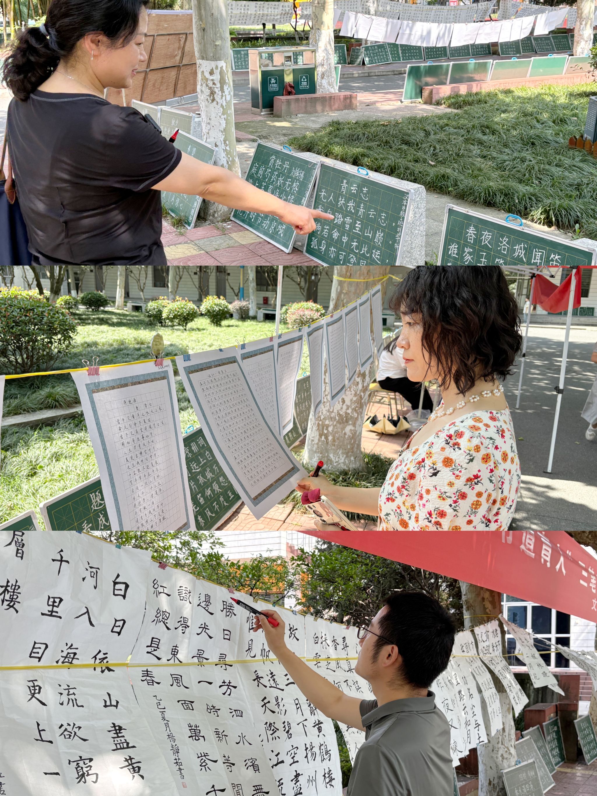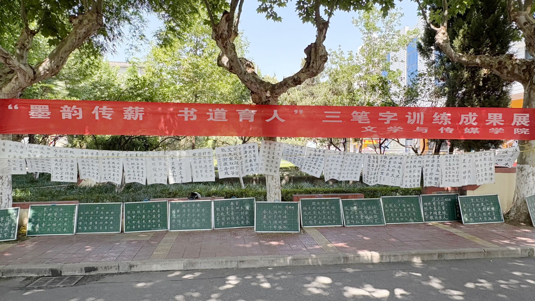 本次活动集中展示了伟德2024级员工在硬笔、毛笔、粉笔三大类书写技能上的训练成果,前期共收到参展作品313幅,经预选后在江南校区2号楼前林荫道两侧现场展示233幅,作品内容涵盖经典诗词、励志名句与传统家训,整体结构工整,布局清晰得当,风格多样,展示了师范生扎实的基本功。