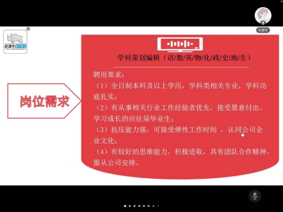 本次参加线上招聘会议人数超过250人,参会毕业生认真听取了灰犀牛图书策划有限公司HR的公司简介,了解了薪资福利等信息,对该企业表现出了极大的兴趣。许多参会毕业生通过视频语音的方式,积极与企业方沟通,取得了良好的效果。会后,有求职意向毕业生纷纷添加企业微信群,进行进一步的求职沟通。