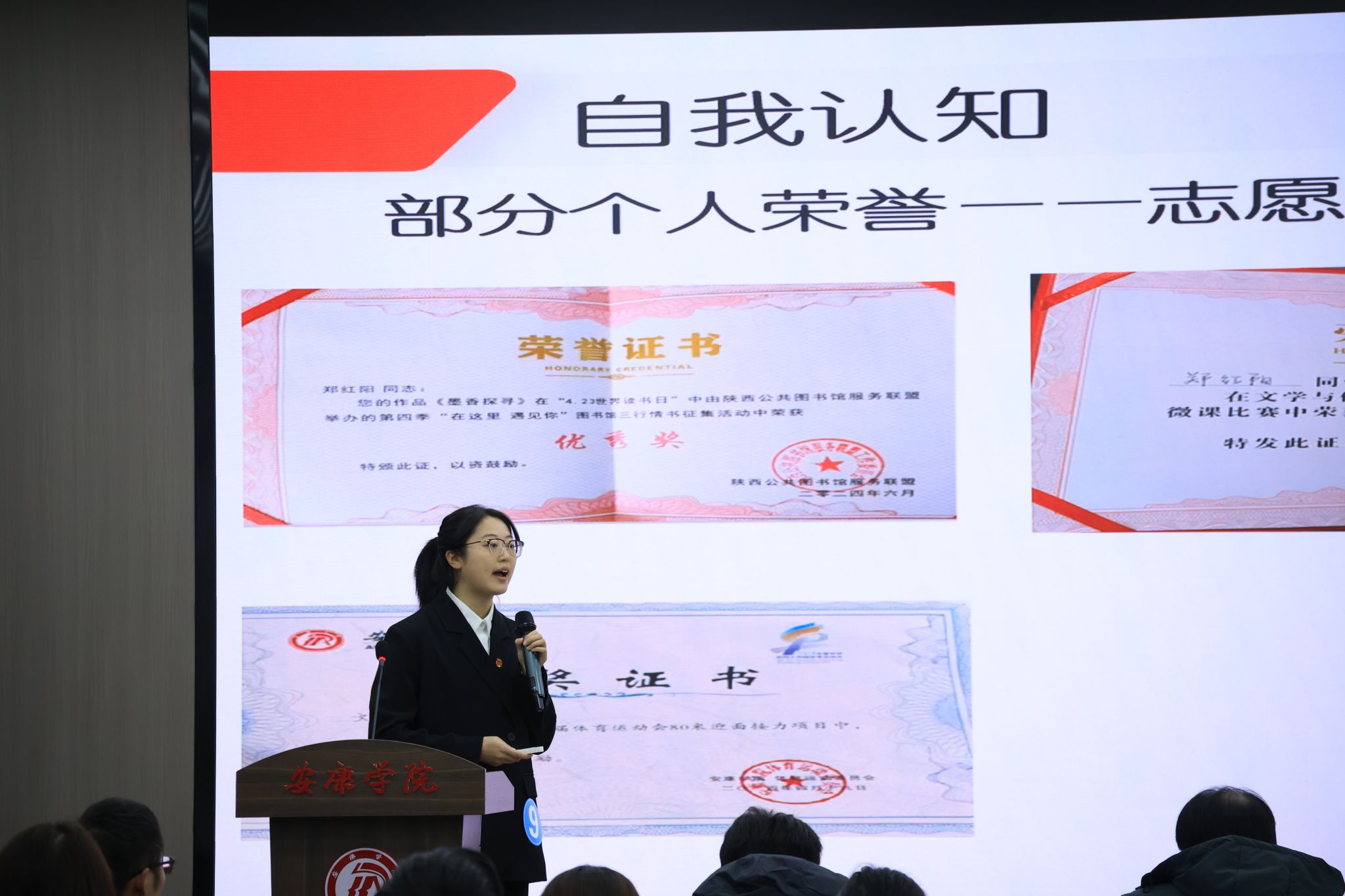 成长赛道上,网络与新媒体2023级1班崔嘉睿同学以“向书本学习,向实践学习”为主题讲述他进入大学来从理论到实践,从计划到实施,在实践过程中找到职业方向,荣获一等奖;就业赛道上,汉语言文学2022级4班郑红阳同学以“提灯引路,筑梦成光——中学语文教师职业规划”为题,凭借扎实的专业基础和清晰的职业规划,获得二等奖。他们深入分析就业市场需求,展示自身的优势与潜力,在计划实施过程中不断突破自我,充分展现文传学子在职业发展道路上的无限可能。同时,喻言老师荣获优秀指导老师称号。