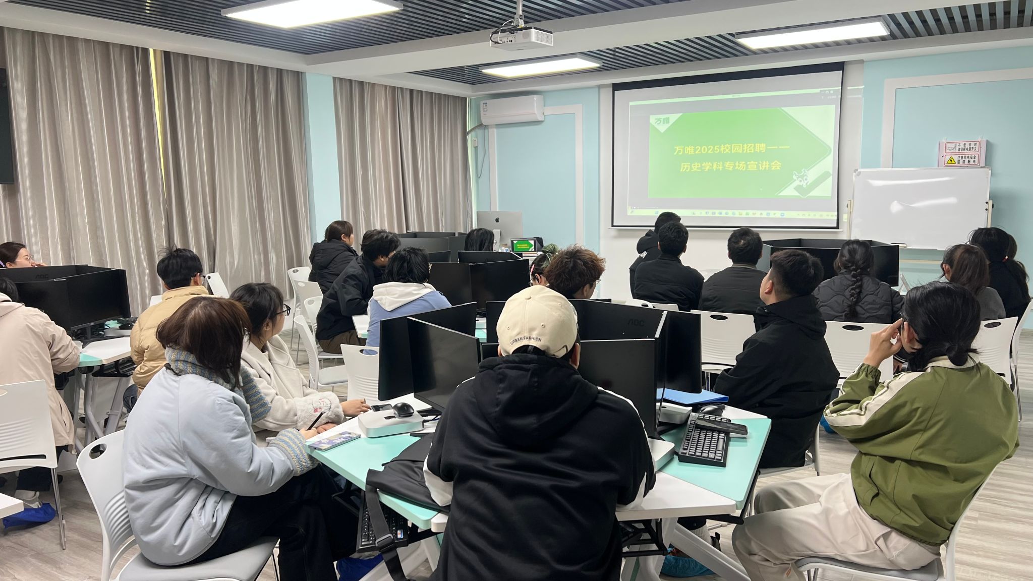 作为全国中考教辅领域的标杆企业,万维集团本次专设历史学科招聘专场,吸引员工积极参与。宣讲会中,企业负责人主要通过公司介绍、岗位介绍、培训与福利和答疑环节这四个方面来向大家介绍,不仅向大家展示了优质企业的招聘要求,还为大家剖析了岗位职责与晋升路径。现场员工通过大屏幕实时观摩云端宣讲,就职业发展、薪资待遇等问题踊跃提问,现场氛围热烈。