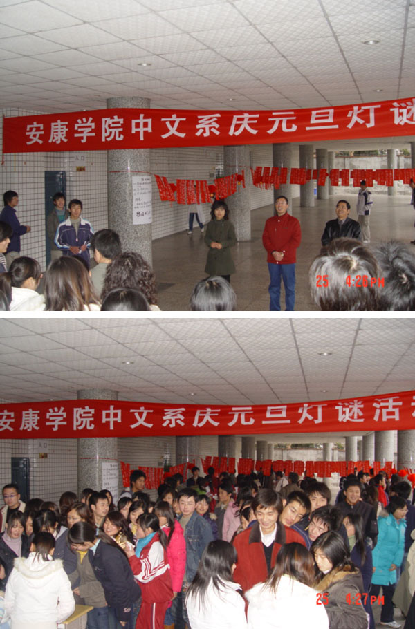 导航痕迹 首页 > 新闻通知 > 公司新闻 > 正文 公司新闻 通知公告 我系举行“庆元旦灯谜活动” 来源:伟德 发布日期:2008年01月04日 阅读次数: 为了弘扬传统文化,拓展同学们的文化视野、营造校园文化氛围、丰富同学们的课余生活,我系于12月25日下午4:30分在东校区一号教学楼大厅举办了“庆元旦灯谜活动”。 本次活动由我系主办,06级文秘班承办,设立灯谜依次分为易、中、难三等,答对灯谜者均有精美礼品赠送。我 系党总支书记沈军、团总支书记邹棠华、辅导员何媛出席并参加了本次活动。