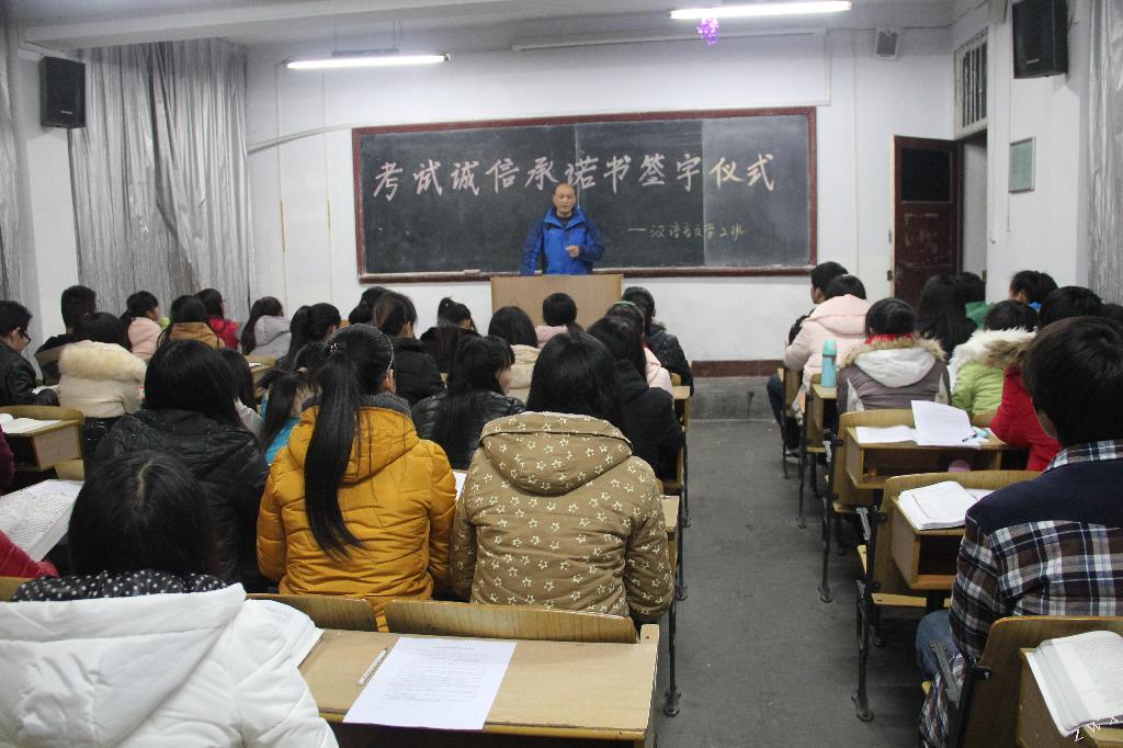 导航痕迹 首页 > 新闻通知 > 公司新闻 > 正文 公司新闻 通知公告 中文系召开“考风考纪”动员大会 来源:伟德 发布日期:2015年01月11日 阅读次数: 2015年1月9日上午,中文系在江南校区大礼堂召开“考风考纪”动员大会。中文系党总支书记李岩、副主任梁卫华、学工办主任郝礼军、辅导员邹棠华、艾全霞以及全系900余名员工参加了大会,会议由郝礼军主持。 首先,梁卫华副主任就期末考试应注意的相关事项做了强调和说明,带领大家学习了公司及学工部下发的“关于加强考风考纪教育,严肃考试纪律”等文件,提醒员工认真做好考前准备,端正态度,遵守考试纪律,希望大家在此次考试中考出真实水平,取得优异成绩。 秘书学12级1班董昊同学代表全系员工作了发言,并庄重宣誓:考试期间做到诚信考试、杜绝作弊、争取考出优异的成绩。 最后,李岩书记重申了考试纪律,对员工考试期间做出了明确的规定并提出了严格的要求。同时他还希望同学们在寒假期间勤工俭学,主动寻找接触社会的机会,并对假期安全进行了强调和提出了要求。 会后,中文系全体员工签订了诚信考试承诺书。