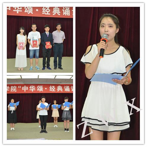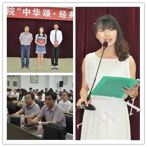 2015年“中华颂—经典作品诵读”活动于五月二十日晚在图书馆六楼报告厅落下帷幕。此次活动由校团委主办,中文系承办,前后历时一个多月,有十四个班近二百名员工参加。活动分班级诵读、预赛、决赛三个环节进行。五月二十日晚举办了中华经典作品诵读决赛,中文系党总支书记李岩,副主任梁卫华,辅导员邹棠华、沈菲亲临现场予以指导。