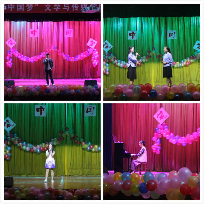 随后由单招班和汉语言文学三班朗诵《盛世中国》,正式拉开了晚会的序幕,蕴含充沛情感的朗诵与舞蹈令人对我们的祖国感叹与自豪。《礼仪之邦》的舞蹈使我们感受到中国自古以来的礼仪是如此的美妙,不愧为礼仪之邦。汉本一班王菲演唱的《龙卷风》,将晚会现场带入了一个新的高潮,呼声不断,激情肆溢。《致橡树》的朗诵,将我们带进了美丽的文字中,感受到了丝丝情意,心中无限安谧。一首《小幸运》使我们感受到了歌词中的美好与幸运。秘书班的舞蹈《boom club》激情四射,青春无限。《成都》仿佛将我们带到那成都的街头漫步。《罗密欧与朱丽叶》的钢琴独奏使现场浸润在流水的琴声中。影视戏剧社的《新还珠格格》内容新颖,惊喜不断,引发爆笑连连。独舞《Red》燃爆现场气氛。独唱《没有什么不同》令人感动不已。舞蹈《大鱼》带领观众体会了中华神韵。集体朗诵《少年中国说》令人慷慨激昂,振奋人心,少年强则国强!