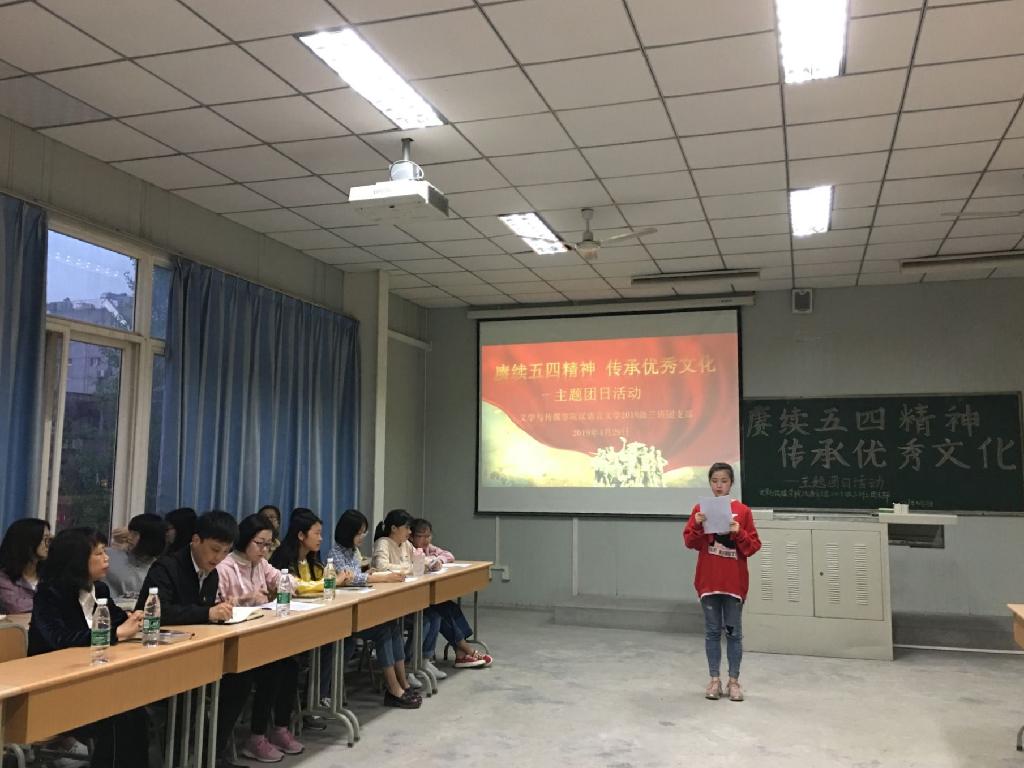 为纪念五四运动100周年,深入学习习近平总书记在中共中央政治局第十四次集体会议讲话精神,加强对五四运动和五四精神的学习理解,4月29日晚上七点半,2018级汉语言文学专业3班在1024教室开展了“赓续五四精神,传承优秀文化”主题团日活动,伟德团委书记李光梓,文学与传媒公司党总支书记于咏梅,团总支书记、学工办主任沈菲,伟德辅导员艾全霞,以及汉语言文学2018级3班全体同学参加了本次活动。