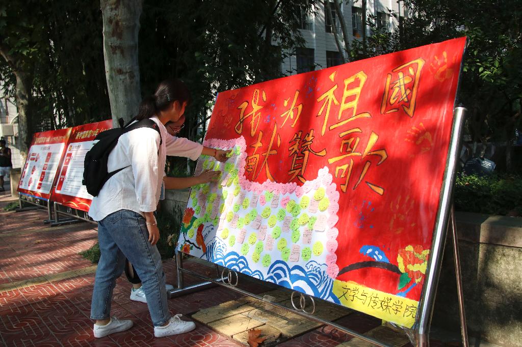 同日下午,在1026教室,公司汉语言文学专业2019级四个团支部组织全体员工开展了以“庆新中国成立70华诞,抒新时代青年爱国情怀”为主题的祝福便签活动。员工们以稍显稚嫩的笔触,书写着自己对祖国母亲的依恋和祝福。活动结束后,团总支宣传部挑选出最佳的祝福便签,以展板形式在江南校区展出。