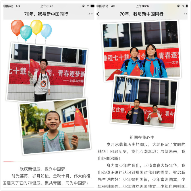 此外,公司同步开展了线上活动。由网络与新媒体2018级1班团支部全程负责,2018、2019级各团支部参与,拍摄主题为“我为祖国献祝福”的短视频,随后在公司官方抖音账号上进行发布。同时,公司官方微信平台“爱中文”也面向全院发起主题征文活动,并将以“70年,我与祖国同行”为主题进行专题推送。