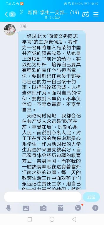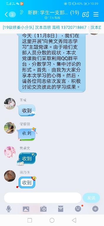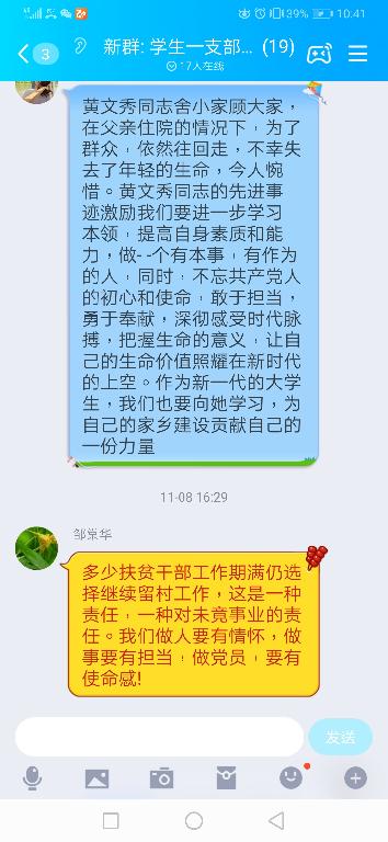 2019年11月8日15:00,根据上级党委通知要求,伟德公司员工第一党支部利用QQ群网络平台,采取分散学习、集中讨论的形式举行了“向黄文秀同志学习”主题党日。本支部全体党员参加此次党日,由彭潇领学。