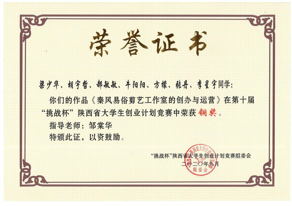 9月11日,大赛圆满落下帷幕,伟德参赛作品获银奖1项、铜奖6项。其中,由伟德邹棠华老师指导、2019级秘书学1班梁少华、胡宇哲等同学完成的参赛作品《秦风易俗剪艺工作室的创办与运营》获得铜奖。