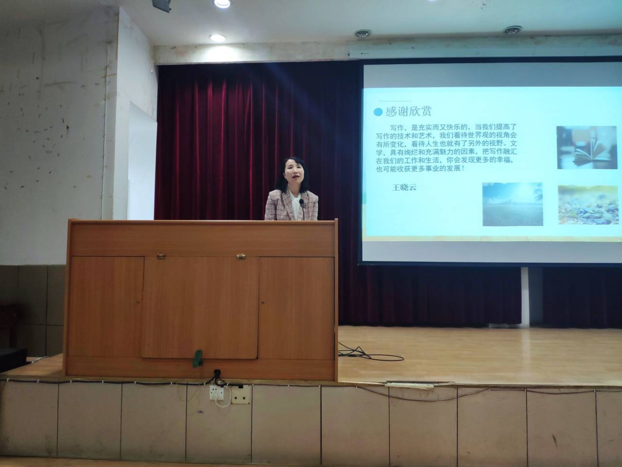 王晓云老师讲授的主题是“写作小说的几个关键词”,主要从小说的五个基本要素:语言、故事、结构、人物和精神等展开讲授,并通过列举大量国内外小说作品详细阐述自己的观点。她通过小说与诗歌、散文的比较来谈小说语言,认为“小说语言是基本要素,是文字工作者必不可少的基本功”,并鼓励同学们平时多加训练。在讲述小说故事时,更是引经据典,说明故事在小说写作地位中的重要性,“小说之所以引人入胜,故事的作用功不可没”。“小说结构问题,是常常被人忽视的问题”,王晓云老师以发展的眼光谈了古今小说在结构上的变化,引起了同学们的高度重视。“小说精神,是一个小说超越其他普通小说最重要的方面”,她通过讲述《桂河大桥》《肖申克的救赎》等电影情节,将这一观点由浅入深地传授给同学们。王晓云老师观点鲜明,概括全面,引人深思;语言幽默诙谐,充满智慧和情趣。同学们注意力集中,收获颇多。