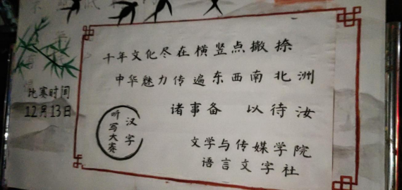 我们中国的汉字,落笔成画留下五千年的历史。为传承语言文化,展现汉字魅力,伟德隶属的语言文字社于江南校区举办了以“千年文化尽在横竖点撇捺,中华魅力传遍东西南北洲”为主题的汉字听写大赛活动。