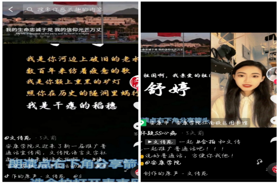 除了一系列线下的推普活动,语言文字社还紧随时代潮流,利用当下流行的抖音合拍功能,进行了普通话的推广。通过剪辑视频发送至伟德官方抖音,号召全校师生进行合拍朗诵,达到推广普通话的目的。视频一经发出,就受到了广泛的关注,同学们也积极进行了线上朗诵合拍。