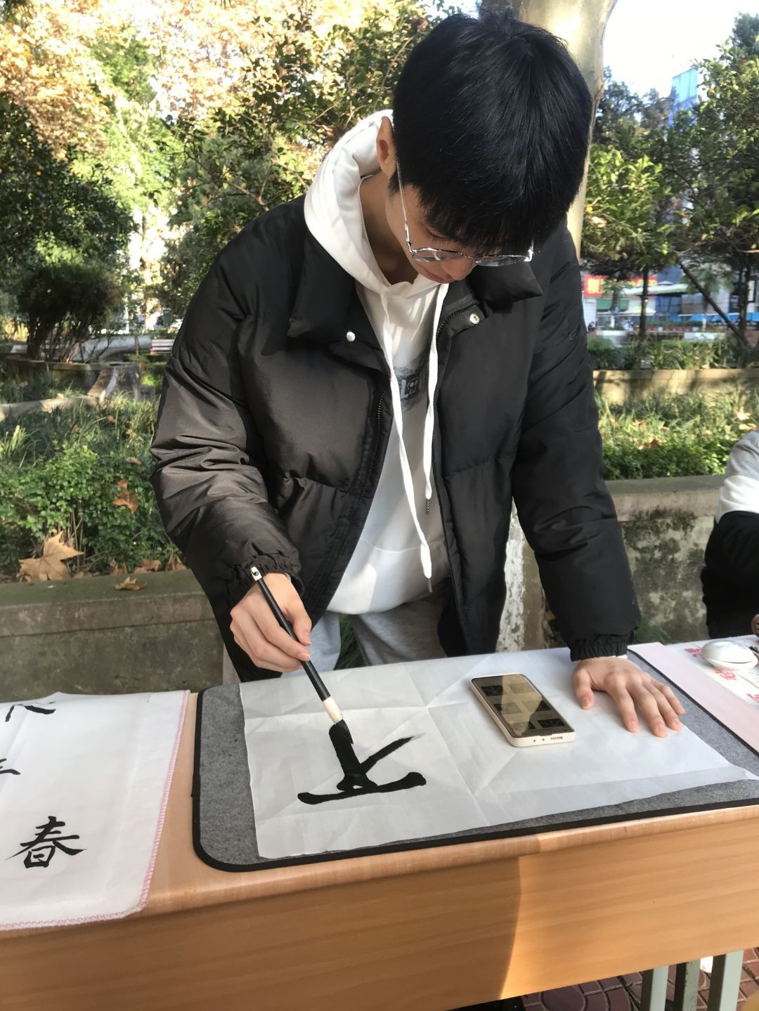 初冬的午后阳光明媚,校园内的林荫道更显诗情画意,同学们现场泼墨挥毫,在现场留下了精彩的作品。同时我社还邀请到了张富华老师莅临现场进行指导,张富华老师耐心讲解,对现场展示的作品逐一点评,同学们都受益匪浅。最后张富华老师还在现场挥毫写下了“宁静致远”与“业精于勤”两幅墨宝赠予书法社,也表达了老师对于社员们的深切期盼。