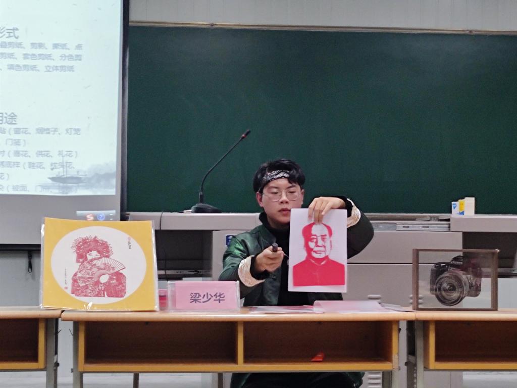 活动开始,梁少华为大家播放了剪纸纪录片,设计了耳闻,目见,足践,手辨四大板块,并提问有关剪纸方面的问题,以便使同学们更好的了解剪纸文化。之后梁少华又向大家介绍了剪纸的技巧以及方法,让同学们学会了折剪法,掌握了一些“折、画、剪”的小窍门。