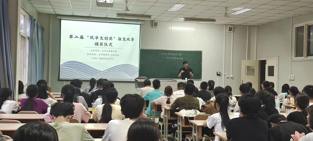2022年5月27日晚上8点,第二届“风华文创奖”征文比赛颁奖典礼在伟德江南校区1026教室顺利举行。文学创作社指导老师李春平、风华诗社指导老师韩文霞、特邀嘉宾曹刚老师、风华诗社和文学创作社社团成员、网络与新媒体2021级同学及获奖作者代表出席本次活动。