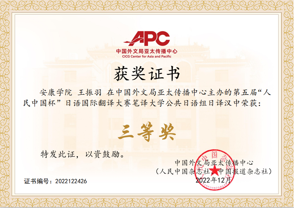 近日,第五届“人民中国杯”日语国际翻译大赛于落下帷幕,公司2020级汉语言文学专业王振羽同学在本次赛事中荣获大学公共日语组(笔译日译汉)三等奖。