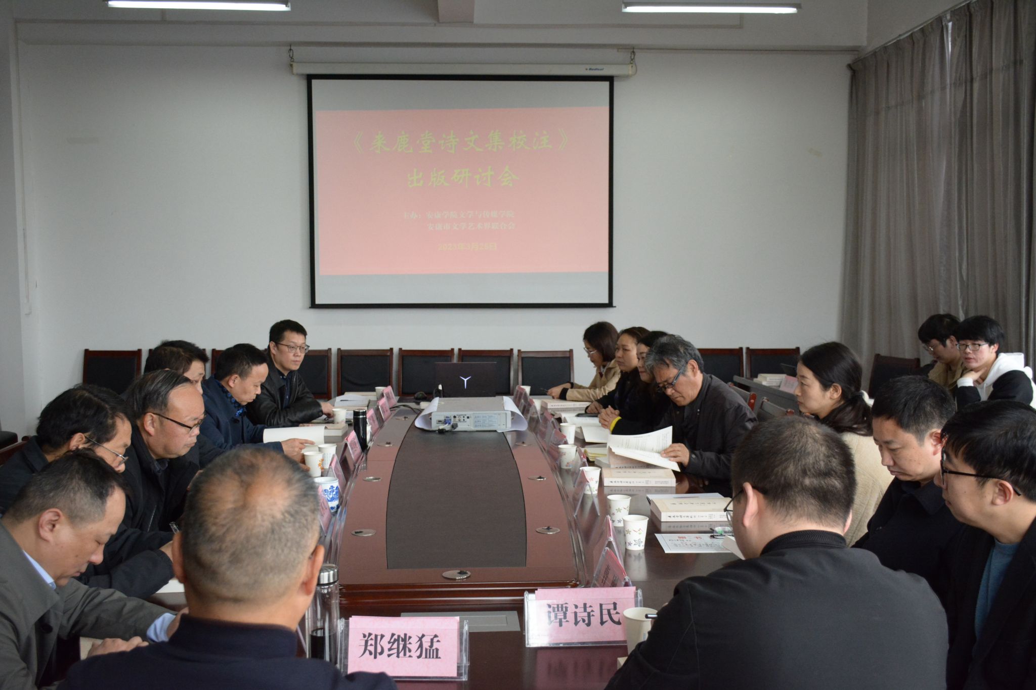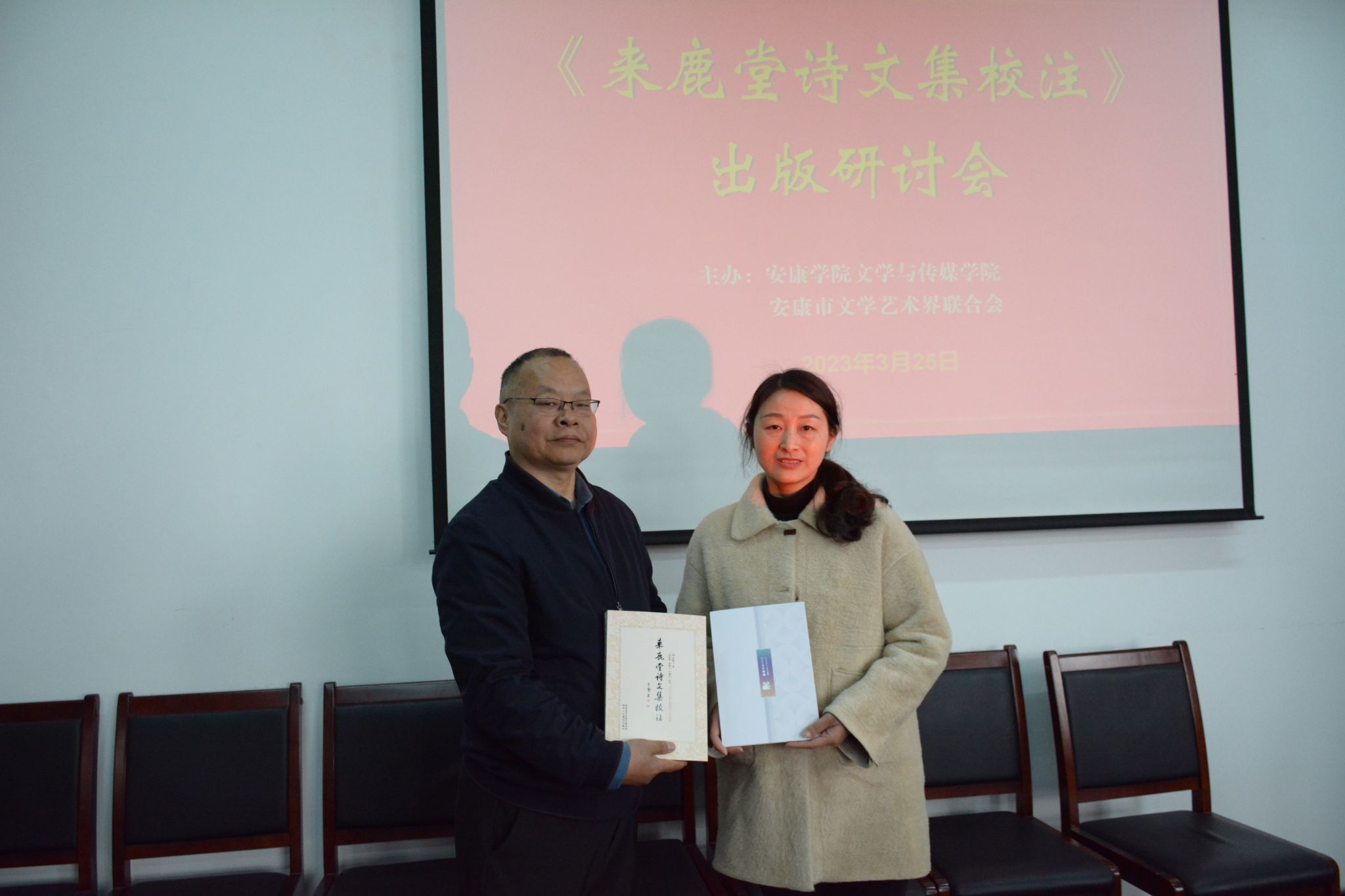 赠书结束后是自由研讨环节,与会人员分别就《来鹿堂诗文集校注》谈了自己的感想和见解。戴承元教授认为郑继猛教授十年间出版了4部地方文献校注著作,而且善于选择有价值的对象进行校注,在校注时边进行史料收集,边进行田野考察,其对《来鹿堂诗文集》的校注,既能以文注史,使安康历史更加鲜活;又能印证安康地域文学成就,促进地方文化自信;还可凝聚一批研究团队,彰显伟德服务地方的办学宗旨。李焕龙先生补充说明了《来鹿堂诗文集》的作者张鹏飞的基本情况,认为其作品是研究安康历史文化的重要资料,郑继猛教授的整理校注对于后人进行安康历史文化研究具有重要的帮助价值;同时介绍了安康古代文献的保存现状,呼吁与会者关注安康历史文化典籍的整理保存。李景林教授高度评价了郑继猛教授的古籍整理和校注工作,杨明贵副教授提议在《来鹿堂诗文集校注》的基础上,开展对张鹏飞其人、其作品的相关研究,深挖其文学价值和其创办的来鹿堂刻书局的全国性贡献。陈春苗、唐玉梅、王娅莉、王晓群、梁真鹏等校外研究专家从不同角度肯定了郑继猛教授从事地域文化研究的担当精神,以及《来鹿堂诗文集校注》的地域文化研究价值;曹刚、谭诗民、崔德全、胡少山等校内中青年教师则结合各自所学,分析了《来鹿堂诗文集校注》的多方面学术意义和现实价值。