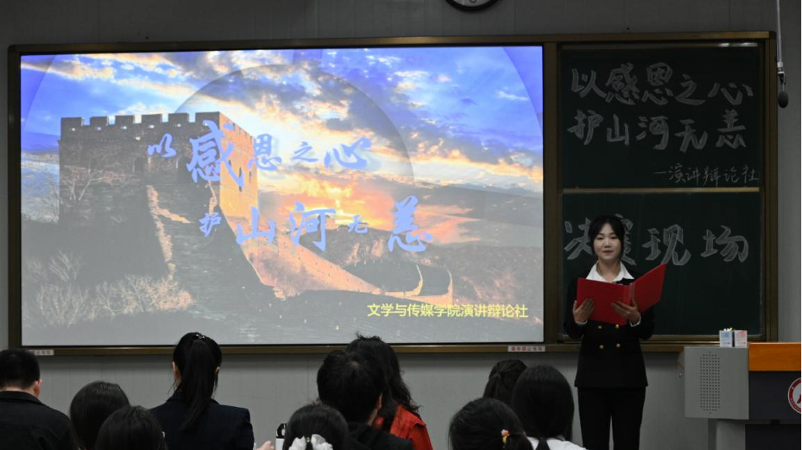 侯红艳副书记在致辞中对演讲辩论社举办的此次活动给予高度评价,并对社团规模的不断扩大表示祝贺。她勉励同学们在比赛中充分展示个人才华,用真挚的演讲传递感恩之情与家国情怀,在感恩中汲取力量,同时预祝本次演讲比赛得圆满成功。