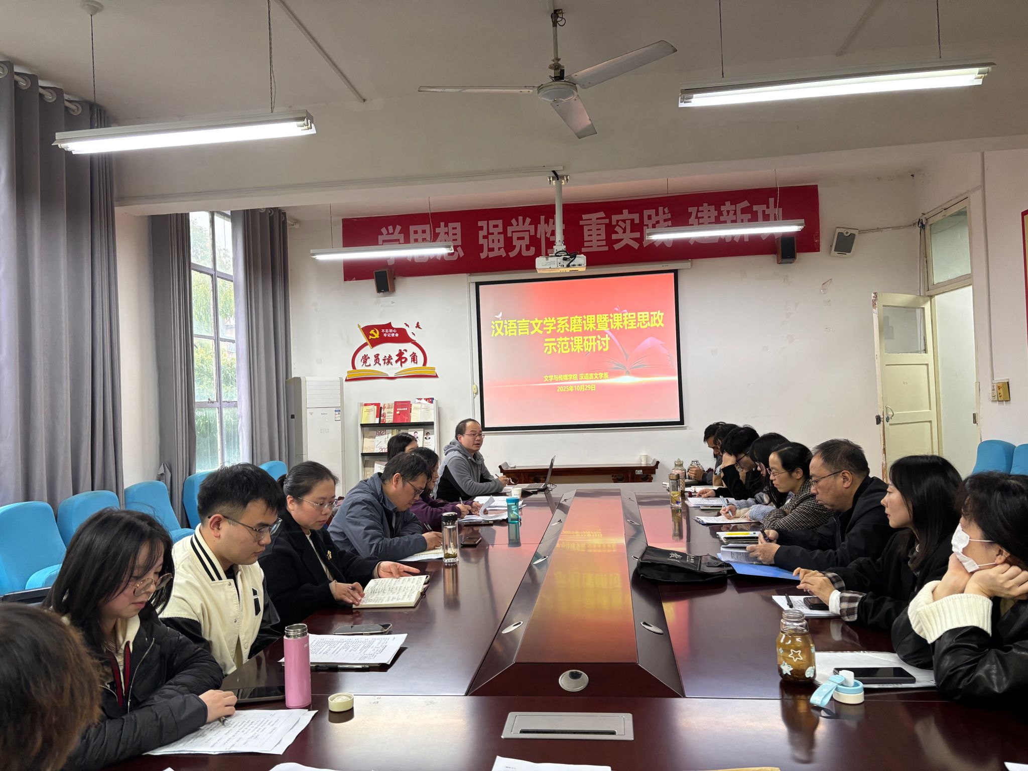 为深入贯彻落实立德树人根本任务,配合做好审核评估整改中期“回头看”专家进校考察准备工作,促进教师之间的学习交流,2025年10月29日下午,汉语言文学系举办了磨课暨课程思政示范课研讨活动。本次教研活动由汉语言文学系主任谭诗民博士负责组织实施,张格瑄老师进行课程思政示范课教学展示,公司领导、校院教学督导、各系主任以及其他无课教师参加了此次活动。