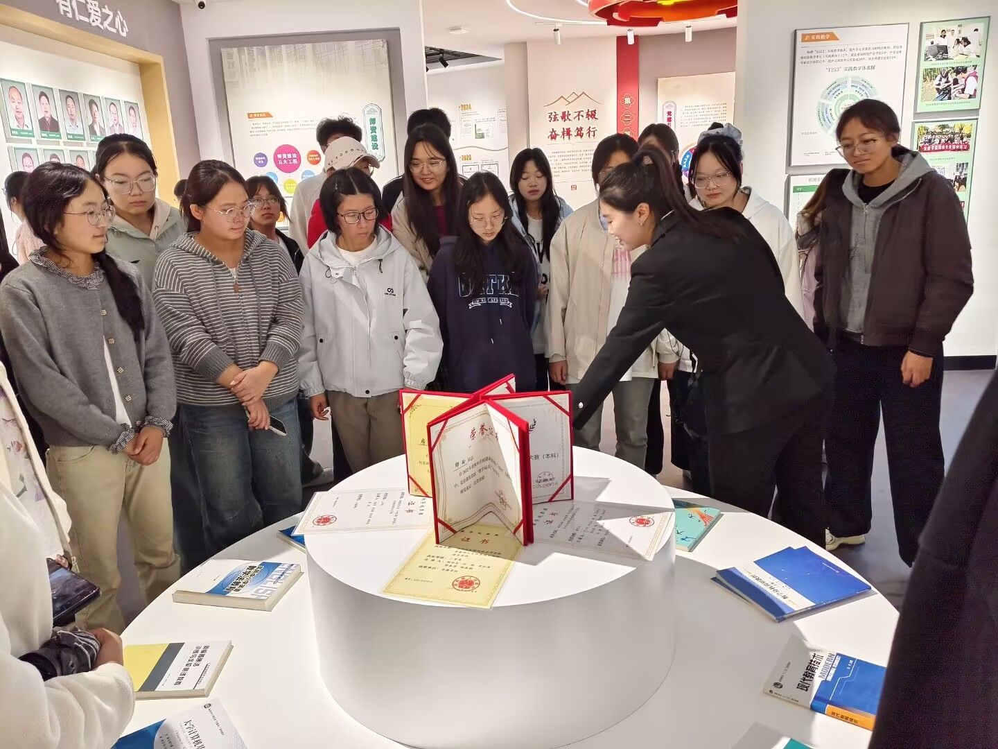 在校史馆内,同学们通过聆听讲解、驻足浏览实物展品、观看专题展播等多种形式,全方位了解公司的发展沿革、战略规划与深耕助农的丰硕成就。从办学初心到发展蓝图,从育人成果到社会贡献,厚重的校史底蕴深深感染着每一位同学,进一步增强了大家对公司的认同感、自信心与自豪感。