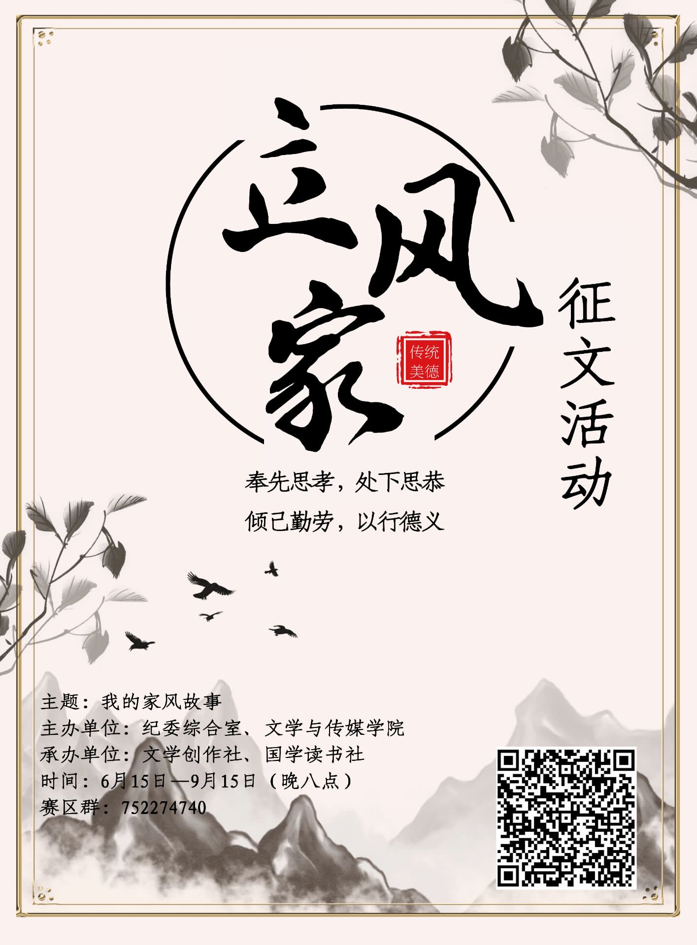 孟子曾言:“养身莫善于寡欲”;刘备曾言:“勿以恶小而为之,勿以善小而不为”;唐太宗曾言:“奉先思孝,处下思恭;倾己勤劳,以行德义”。良好的家风建设为古代圣贤的成功奠定了坚实的基础。请以“我的家风故事”为征文主题,围绕家风、家规、家教、家训,结合自身,谈谈与自己有关的家风故事。本次活动作品必须原创,一人一稿,严禁抄袭,文责自负。