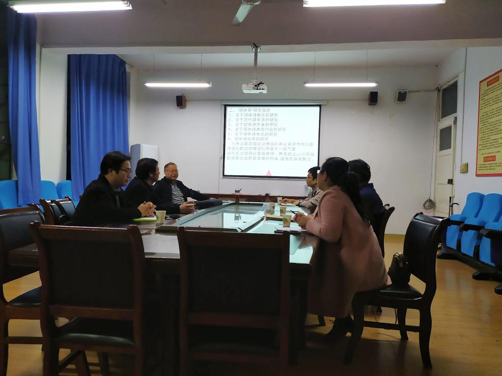 研讨会上,郑继猛教授首先作了题为“百年‘颂体诗’研究综述”的主题报告,从颂类文学梳理及存在、颂类文学研究现状、“颂体诗”研究、“颂体诗”研究存在的问题、“颂体诗”研究的前景与价值五个方面,对“颂类文学”和“颂体诗”的整体研究情况进行了全面细致地阐述。随后,与会教师根据前期准备情况,针对汇报内容进行了热烈讨论,重点就“颂体诗”的起源和分类、“颂体诗”的发展分期、“颂体诗”的文化阐释、“颂体诗”与思想史研究、“颂体诗”的语言及音律研究等问题进行了深入交流。老师们一致同意此课题非常具有研究价值,但目前研究方向不宜过宽,应先确定具体研究范围,从小处做起,从分段做起。