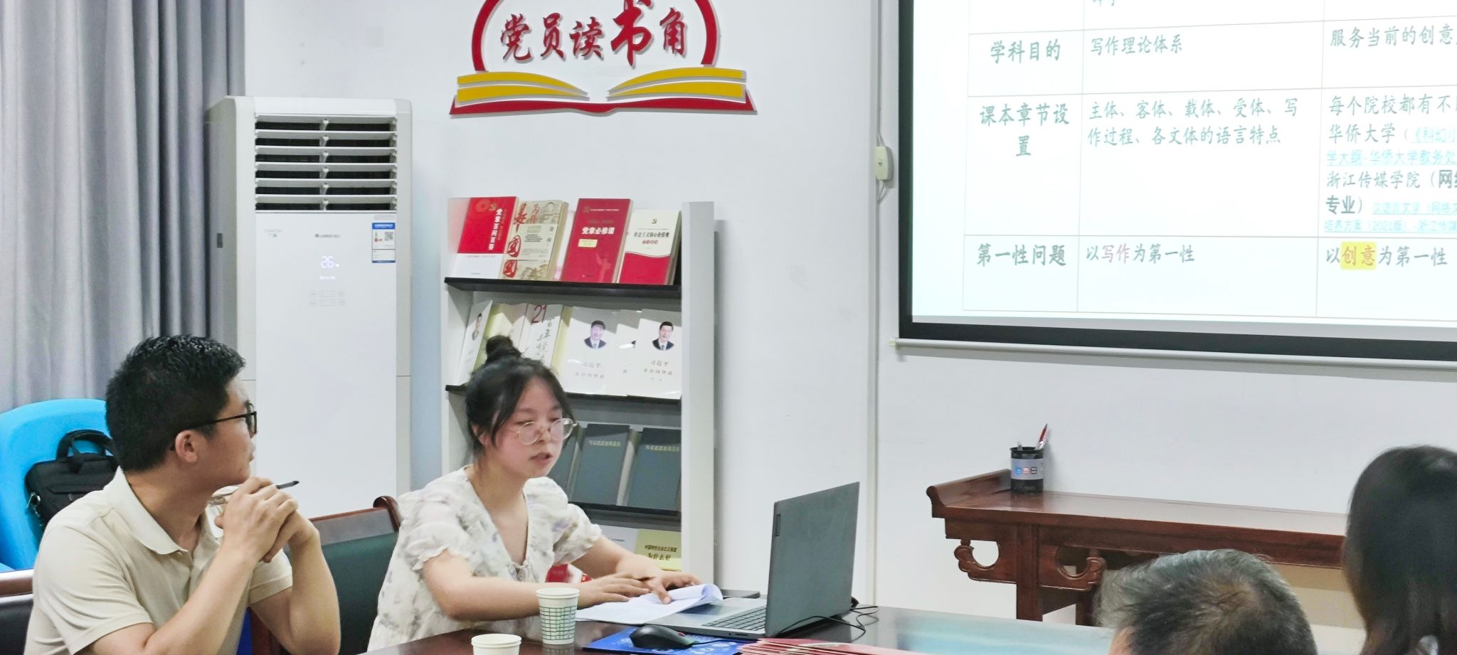 活动开始后,鲁雨溦老师做了题为《当前创意写作课程的教学实践案例探究》的学术报告。报告中,鲁雨溦老师首先对创意写作学科进行了简要介绍,分析了传统写作学与创意写作核心理念别的区别,其次通过清华大学、浙江传媒公司、厦门大学等创意写作教学案例详细分析了创意写作“作家工坊制”“项目式写作”“唤醒式教学”三种模式,接着结合本人的亲身经历阐述了“TOP”教学法的引导方式,并梳理出此教学法在实践过程中的优劣,最后总结了当前创意写作课程的教学在新文科和交叉团队建设的背景下的发展趋势。