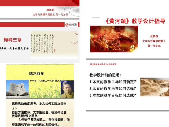 9月份张格瑄、周海霞、韩文霞三位同志分别从对员工进行教学指导、教学设计及课程思政角度为大家解读了《黄河颂》、《梅岭三章》、《土地的誓言》。张格瑄同志认为语文课不能上成政治课,革命文化的渗透要体现在字里行间的赏析品读和感悟体会中;通过周海霞同志的分享,大家再次学习了陈毅同志为革命献身的凛然正气、视死如归的壮烈情怀和对革命胜利的坚定乐观信念;韩文霞同志解读的《土地的誓言》让大家在体会“小我”对故乡感情的同时,也感受到了“大我”的国家情怀。