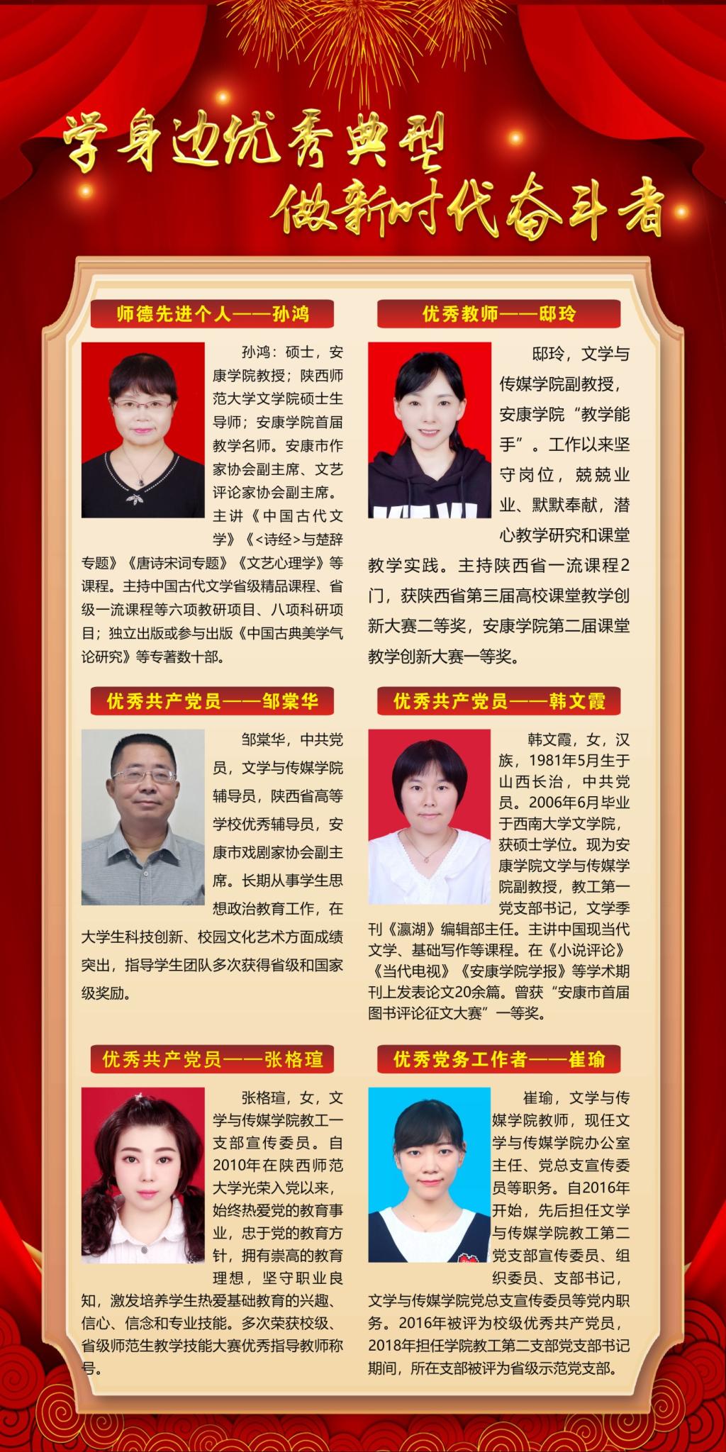 围绕典型示范抓创建,推动公司改革发展到位。开展“学身边优秀典型、做新时代奋斗者”表彰活动,引导广大党员、教师向先进榜样学习,向先进榜样看齐,营造百花齐放、追赶超越的良好氛围。教师党员先锋模范作用进一步发挥,在国一流专业申报、师范专业认证工作中冲锋在前,涌现出了“陕西省教学名师”、“陕西高校本科教学管理工作先进个人”、第四届陕西本科高校课堂教学创新大赛三等奖、“师德先进个人”“优秀教师”“优秀共产党员”“优秀党务工作者”“道德家庭”模范等一批先进典型,并获批了“省级新文科研究与实践项目”“线下一流课程”“线上一流课程”“陕西省高等公司产品成果奖”等一批标志性项目和奖项。员工分会被评为优秀员工分会、团总支荣获“伟德五四红旗团总支”荣誉称号,3个班团支部获“伟德五四红旗团支部”称号,2个班集体获评校级文明班级。1名员工荣获年度陕西省学联员工会先进工作个人,1名员工获2020年度“陕西省老员工自强之星”和“中国老员工自强之星”、第十六届“全国老员工年度人物”(入围奖)。公司党总支荣获2021年“两优一先”表彰“先进基层党组织”称号。公司荣获2021年度公司目标责任考核优秀单位。