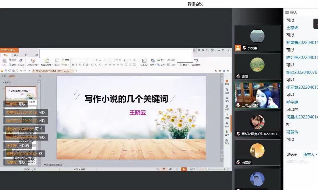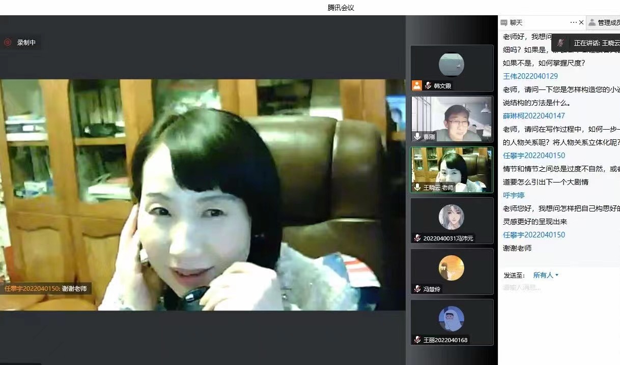 12月13日下午,作家王晓云应伟德邀请,通过腾讯会议与基础写作课校内教师韩文霞、曹刚一同为汉语言文学专业2022级员工线上讲授“小说的写作”。