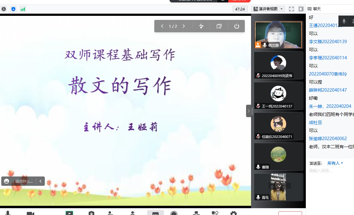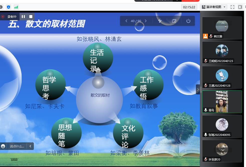 12月7日下午,作家王娅莉应伟德邀请,通过腾讯会议与基础写作课校内教师韩文霞、曹刚一同为汉语言文学专业2022级员工讲授“散文创作”。